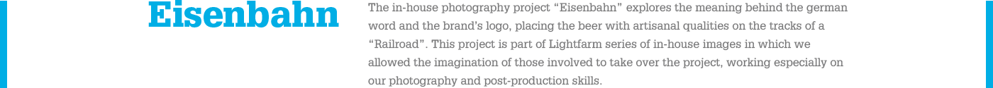 The in-house photography project “Eisenbahn” explores the meaning behind the german word and the brand's logo, placing the beer with artisanal qualities on the tracks of a “Railroad”.